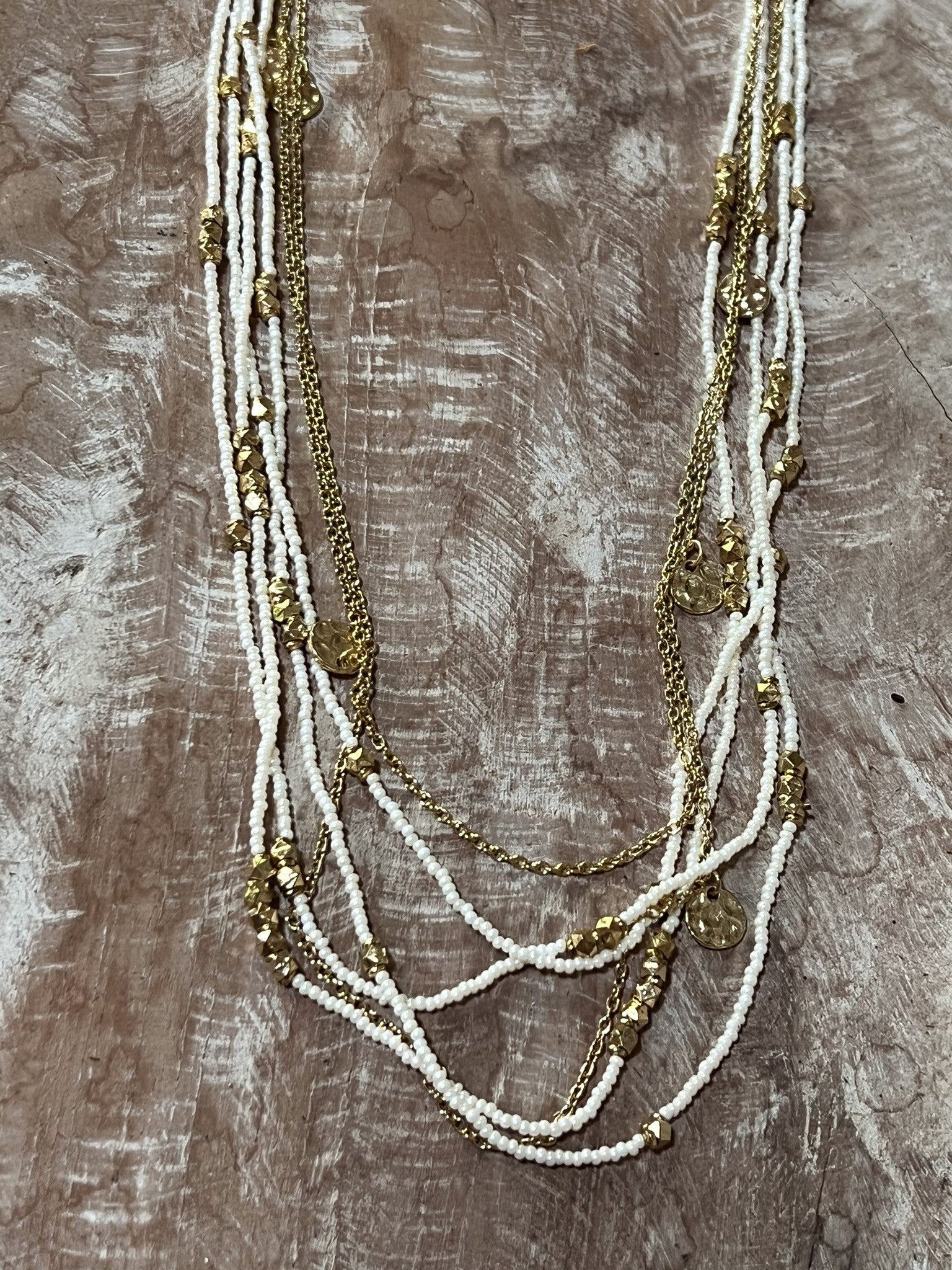 Make a statement with the Casey Necklace. This 6 layer necklace boasts off white and gold beading, with intricate gold details throughout. The gold chain layers feature small gold disks, adding a touch of elegance. Complete with a lobster claw closure, no extender needed.